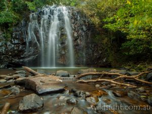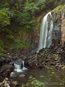 The top tier of the falls are right next to the car park, and cascade in multiple streams over an angled rock slab about 15 metres high. To view the middle and largest tier walk through the cafe then across a bridge that crosses the creek below the upper falls, then turn right immediately to follow a four wheel drive track downhill through regenerating rainforest. About half way to the bottom you will pass a rope and obstacle course – resist the urge to test it out as it is reserved for groups staying at the outdoor education centre. At the bottom of the hill follow the signposted track through more mature forest to an observation platform where you can view the impressive middle tier of the falls, which is about 50-60 metres high, as well as the much smaller but picturesque lower tier. Return back up the track to the car park.
